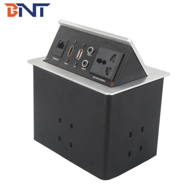 Desktop hydraulic pop up socket box is a multi-functional cable cubby for office AV solutions. It integrates audio, video, data, network, electric power into the hidden box. All configuration on desktop socket could be hidden under table if unused and would be pop up via inner hydraulic pressure support. Top panel of socket box is made of aluminum alloy brushed.