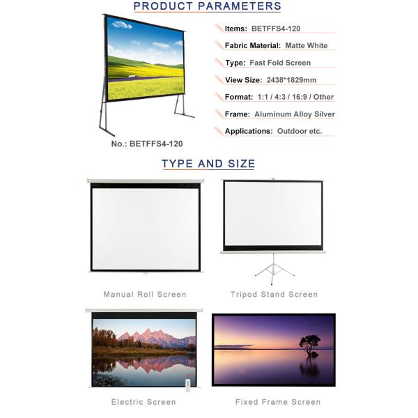Fast fold screen is good design of the projection screen, easy to assemble and carry. Can protect well with an impact resistant carrying suitcase. Not need to fixed on the wall and ceiling, suitable for different needs, such as: exhibitions, banquets, concerts, large-scale business activities, etc..